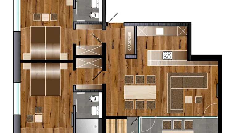 Die Ferienwohnung umfasst 2 Schlafzimmer, ein Wohnzimmer, einen TV und eine gut ausgestattete Küche mit Kühlschrank und Geschirrspüler. Zudem sind 2 Badezimmer mit Dusche vorhanden. Handtücher und Bettwäsche werden bereitgestellt.