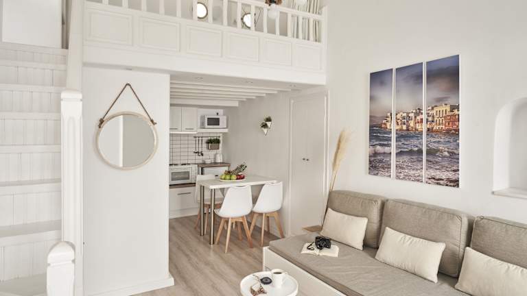 Die Mykonos City Villas befinden sich im Zentrum von Mykonos-Stadt, nur wenige Gehminuten von den Stränden Agia Anna, Agios Charalabos und Megali Ammos entfernt. Die zentrale Lage ermöglicht es den Gästen, die pulsierende Atmosphäre der Stadt zu genießen und gleichzeitig die Schönheit der umliegenden Strände zu erkunden. Beliebte Sehenswürdigkeiten wie Klein-Venedig, das Archäologische Museum von Mykonos und der Alte Hafen sind ebenfalls in der Nähe. Der Flughafen Mykonos ist nur 3 km entfernt und bietet bequemen Zugang zur Unterkunft.