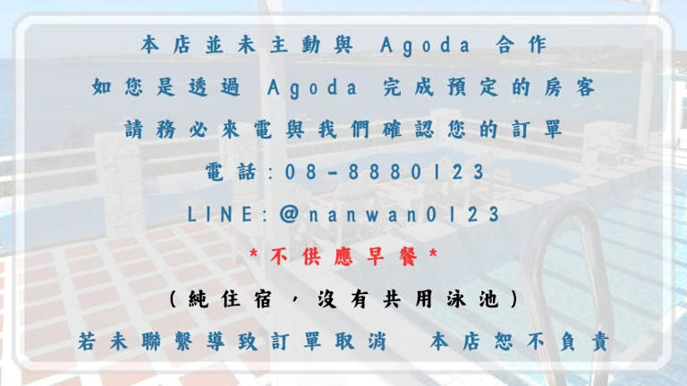 Das Kenting Nanwan Hotel liegt in perfekter Lage, nur 450 m von der atemberaubenden Bucht Pingtung South Bay entfernt. Hier können Sie einen herrlichen Meerblick von Ihrem Zimmer aus genießen. Das Hotel bietet kostenfreie Privatparkplätze und WLAN. Die Zimmer sind klimatisiert und verfügen über einen Flachbild-TV. Im eigenen Bad finden Sie eine Badewanne sowie kostenfreie Pflegeprodukte, Handtücher, Hausschuhe und einen Haartrockner. Zusätzlich können Sie im Hotel Motorroller mieten und eine Münzwaschmaschine nutzen. Eine Gepäckaufbewahrung ist ebenfalls vorhanden. Der Nachtmarkt Kenting ist nur 5 Autominuten entfernt und der Naturpark Sheding erreichen Sie in nur 15 Autominuten.