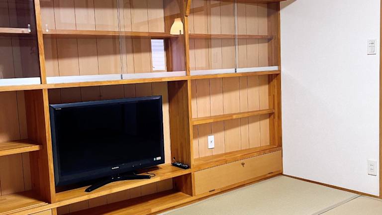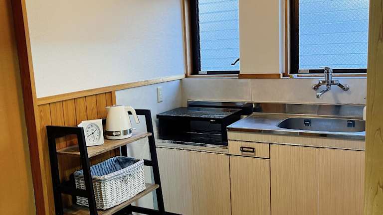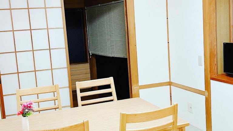 日田ホステル Hita Hostel bietet klimatisierte Wohneinheiten mit Parkettböden, einem eigenen Badezimmer, einem Flachbild-TV, einem Schreibtisch, einer ausgestatteten Küche, einer Terrasse sowie Stadtblick.