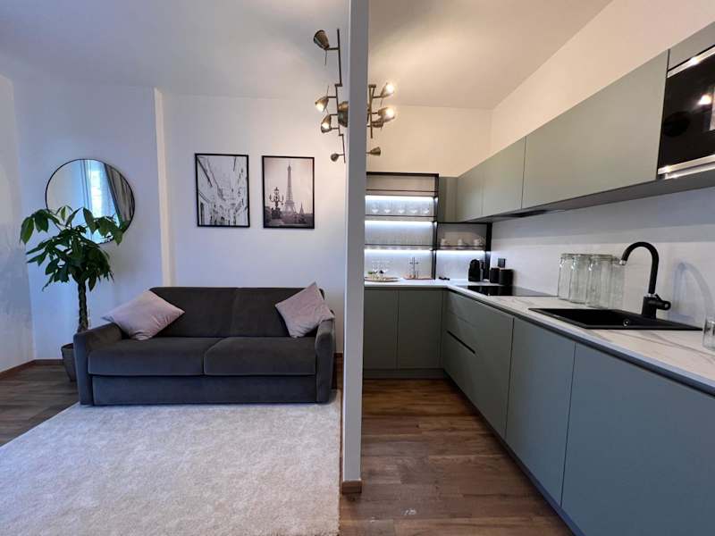 Das Apartment besteht aus einem Schlafzimmer, einem Wohnzimmer, einer voll ausgestatteten Küche mit Kühlschrank und Kaffeemaschine sowie einem Badezimmer mit Bidet und Dusche. Handtücher und Bettwäsche werden bereitgestellt.