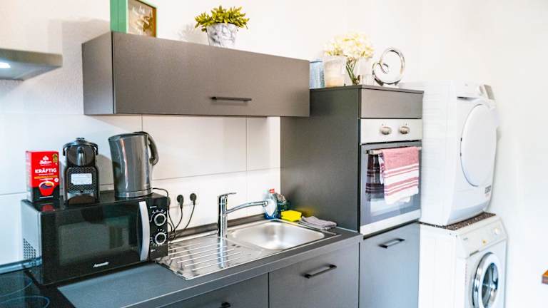 Die Wohnung verfügt über ein Schlafzimmer sowie eine Küche, die mit einem Kühlschrank und einem Ofen ausgestattet ist. Ein Flachbild-TV und ein Sitzbereich sind ebenfalls vorhanden. Das Badezimmer ist mit einer Dusche ausgestattet, und Handtücher sowie Bettwäsche werden zur Verfügung gestellt.