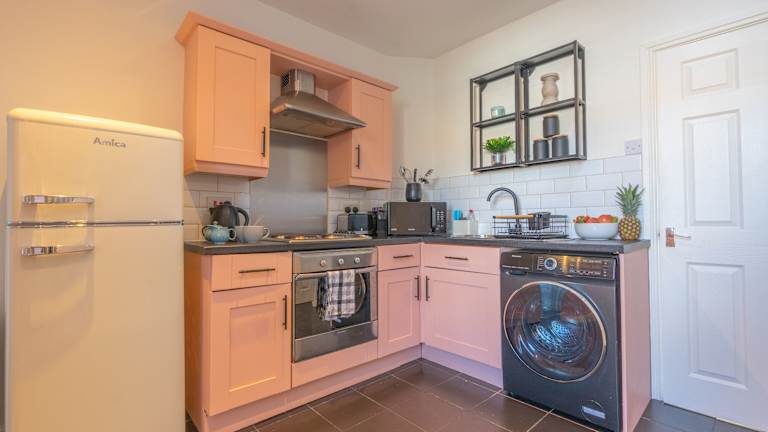 Das Ferienhaus umfasst ein Wohnzimmer mit einem Flachbild-TV, eine voll ausgestattete Küche, die mit einem Kühlschrank und einem Ofen ausgestattet ist, sowie 1 Badezimmer mit einem Haartrockner.