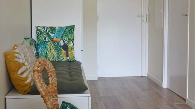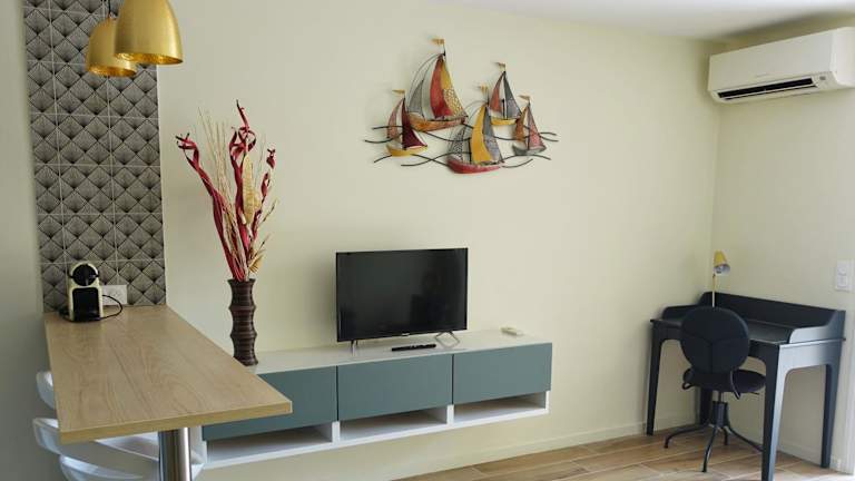 Die Ferienwohnung bietet eine moderne Ausstattung mit einer Klimaanlage und einem Flachbild-TV.