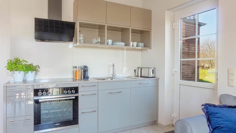 Die Unterkunft enthält eine gut ausgestattete Küchenzeile mit einem Kühlschrank, einem Ofen und einem Toaster.