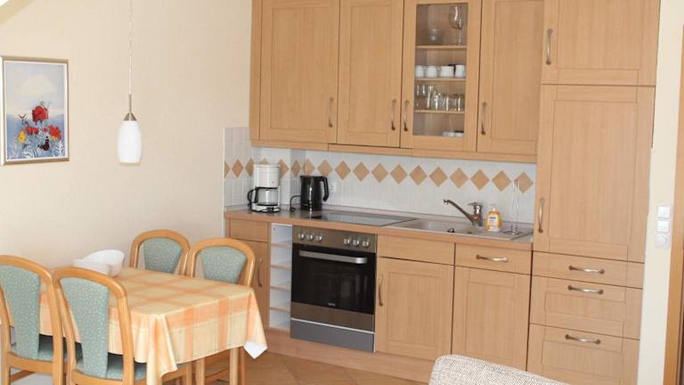Die Ferienwohnung verfügt über eine gut ausgestattete Küche, die mit einem Kühlschrank und einem Geschirrspüler ausgestattet ist. Keine Informationen über weitere Verpflegungsmöglichkeiten verfügbar.