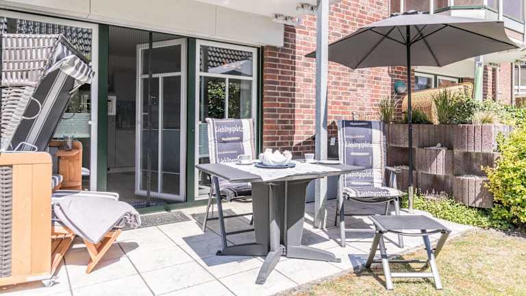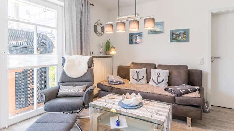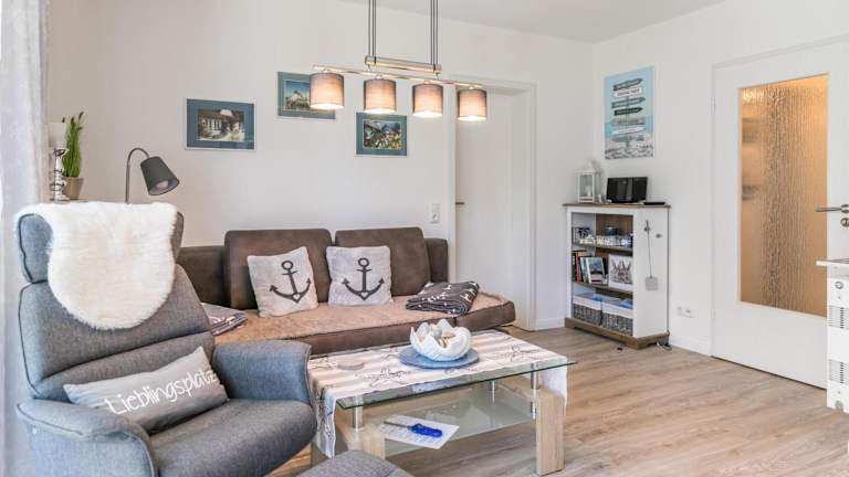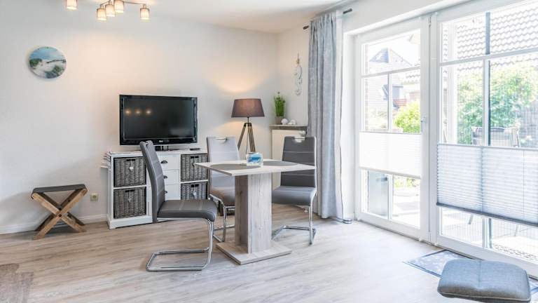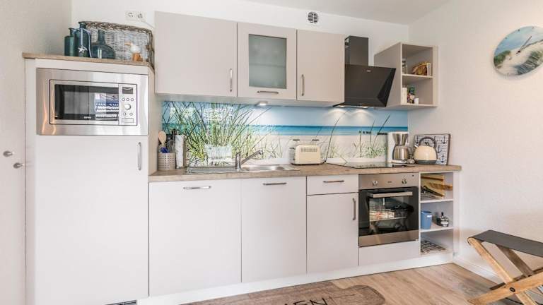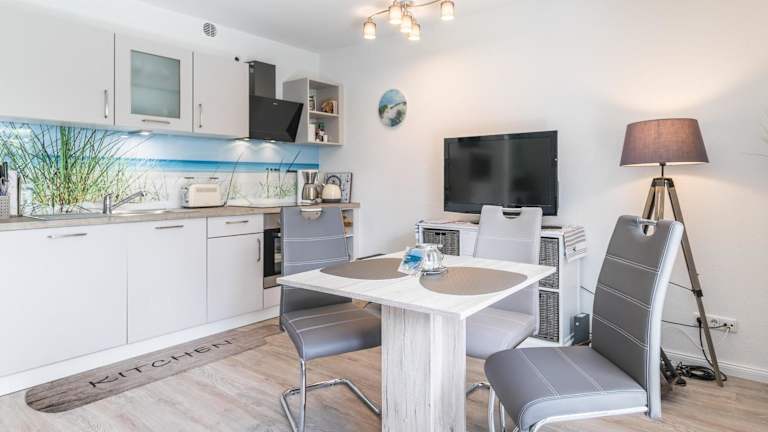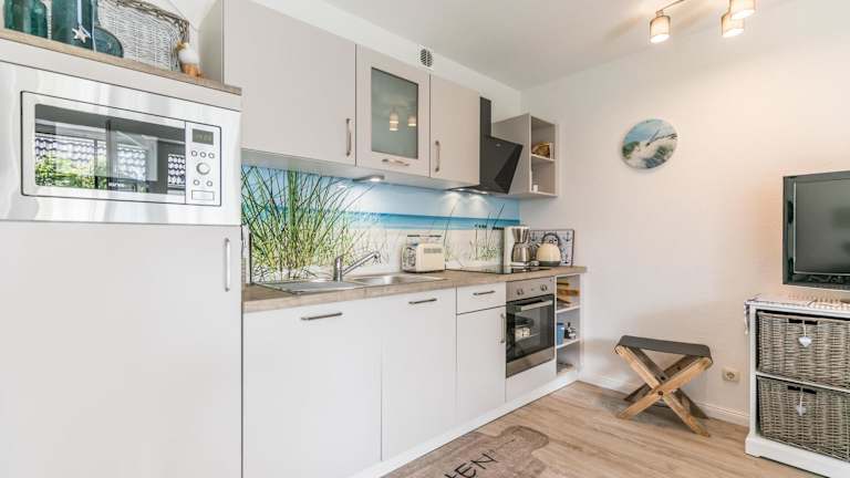 Die Wohnung verfügt über ein Schlafzimmer, einen TV sowie eine voll ausgestattete Küche. Diese ist mit einem Kühlschrank, Geschirrspüler, Waschmaschine, Ofen und Mikrowelle ausgestattet.