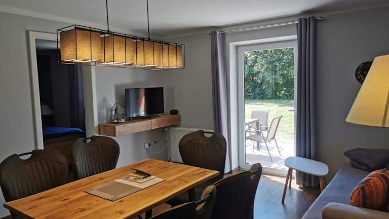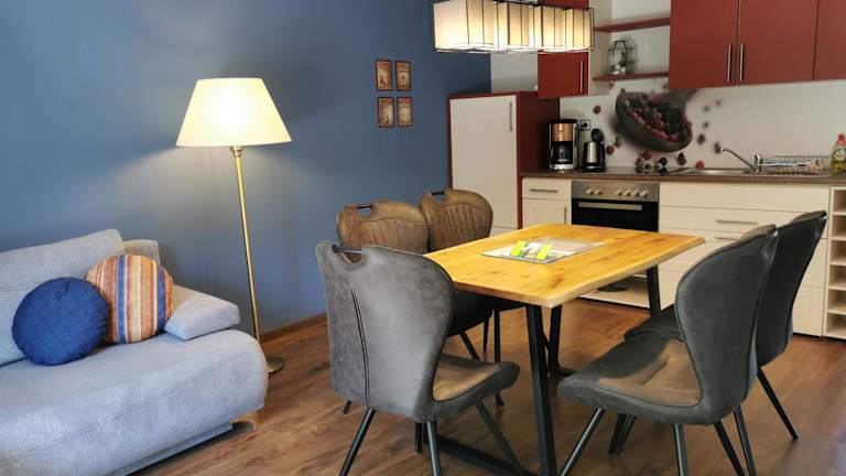 Die Ferienwohnung umfasst zwei Schlafzimmer, ein Wohnzimmer, ein Badezimmer mit Dusche und Badewanne sowie eine gut ausgestattete Küche. Zu den Annehmlichkeiten gehören ein Satelliten-Flachbild-TV und die Bereitstellung von Handtüchern und Bettwäsche. Die Unterkunft bietet Nichtraucherzimmer und ermöglicht die Mitnahme von Haustieren auf Anfrage.