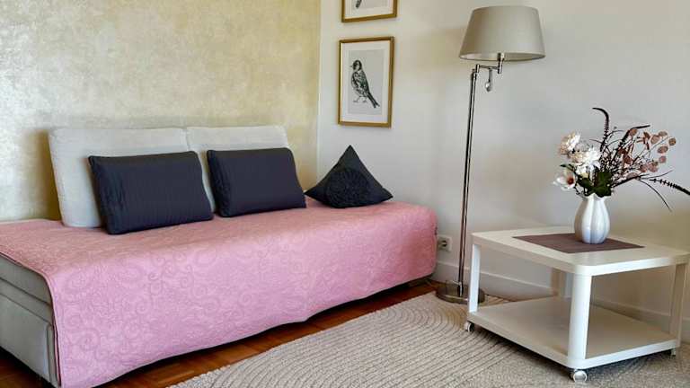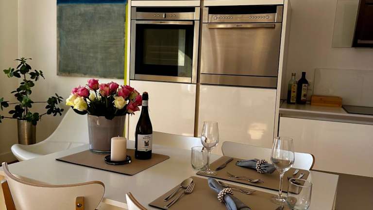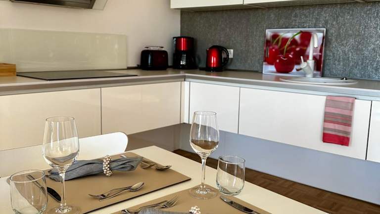 Die Ferienwohnung verfügt über einen Balkon, ein Schlafzimmer, ein Wohnzimmer und eine gut ausgestattete Küche.