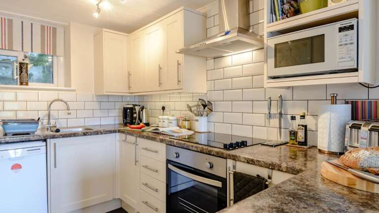 Das Ferienhaus verfügt über ein Schlafzimmer, eine voll ausgestattete Küche mit Kühlschrank und Geschirrspüler, eine Waschmaschine sowie ein Badezimmer. Handtücher und Bettwäsche werden bereitgestellt.