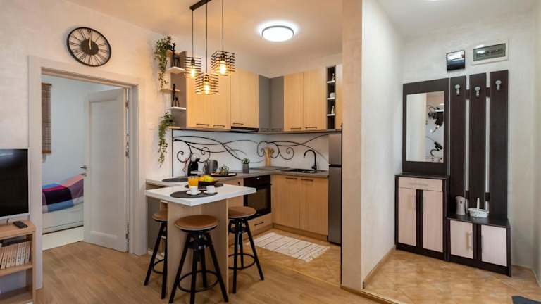 Die Wohnung verfügt über ein Schlafzimmer, ein Wohnzimmer und ein Badezimmer mit einer Dusche sowie kostenlosen Pflegeprodukten. Handtücher und Bettwäsche werden zur Verfügung gestellt.