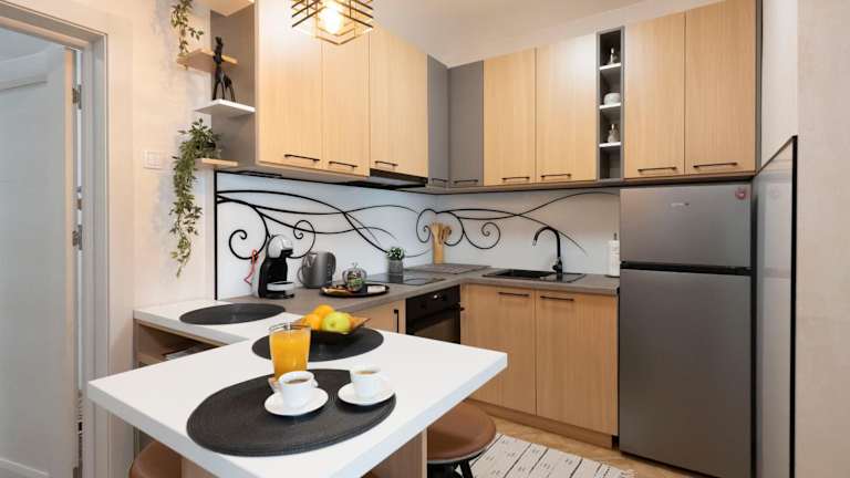 Die Unterkunft beinhaltet eine voll ausgestattete Küche, die mit einem Kühlschrank und einer Kaffeemaschine ausgestattet ist, um die Selbstversorgung zu gewährleisten.