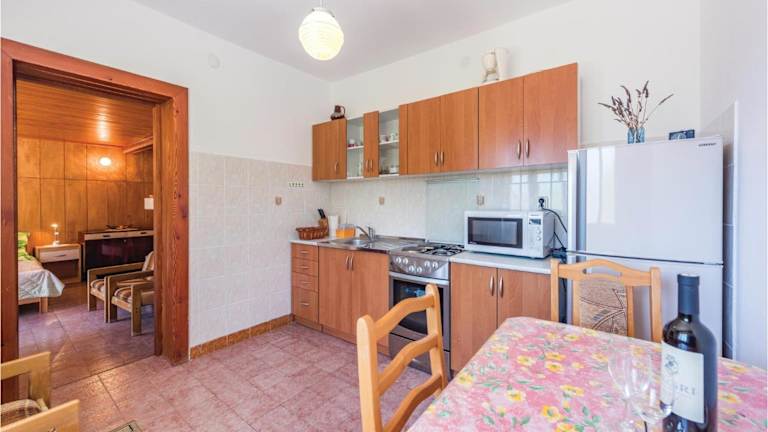 Die Wohnung verfügt über eine gut ausgestattete Küche mit Kühlschrank und Herdplatte, in der Mahlzeiten zubereitet werden können.