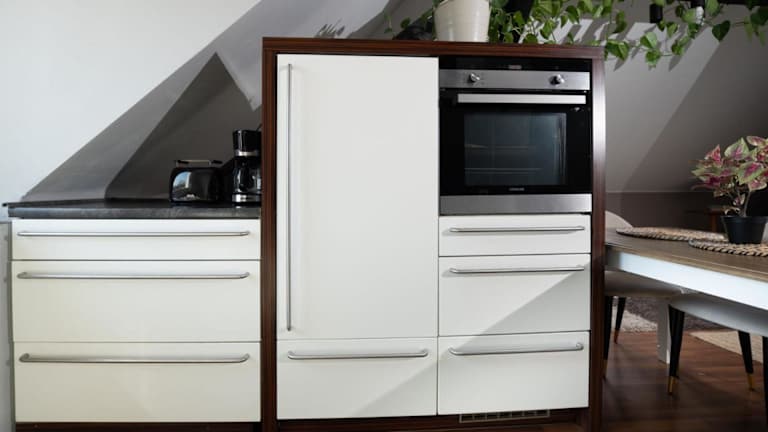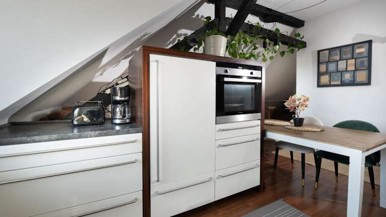 Die Küche der Unterkunft ist mit einem Kühlschrank, Geschirrspüler, Ofen, Kaffeemaschine und Wasserkocher ausgestattet. Essenslieferung in die Unterkunft ist möglich.