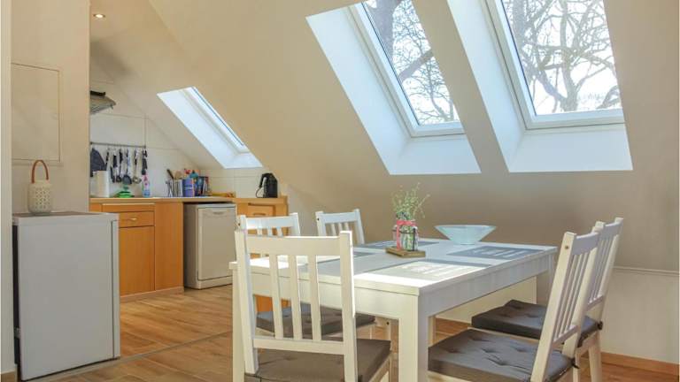 Die Ferienwohnung besteht aus zwei Schlafzimmern, einem Wohnzimmer und einer voll ausgestatteten Küche, die mit einem Kühlschrank und einer Kaffeemaschine ausgestattet ist. Ein Badezimmer mit Dusche steht ebenfalls zur Verfügung.