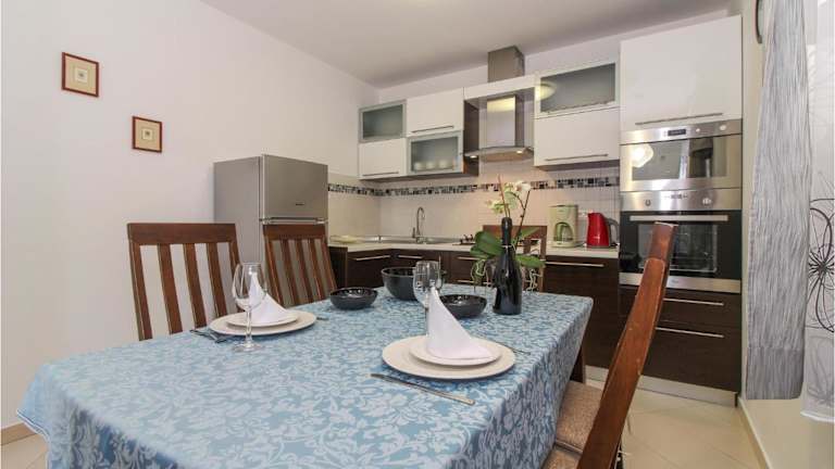 Die Ferienwohnung verfügt über eine voll ausgestattete Küche mit einem Kühlschrank und einer Kaffeemaschine, die die Zubereitung eigener Mahlzeiten ermöglicht. Es sind keine Informationen über zusätzliche Verpflegungsmöglichkeiten oder gastronomische Angebote vorhanden.