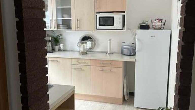 Die Wohnung verfügt über ein Schlafzimmer, ein Wohnzimmer sowie eine voll ausgestattete Küche, die mit einem Kühlschrank und einem Ofen ausgestattet ist.