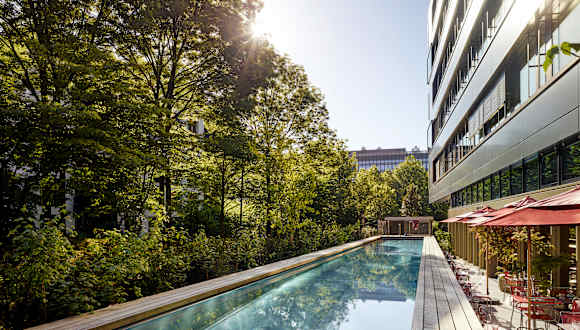126 Gästezimmer • Minibar • Safe • kostenfreies high-speed W-Lan im ganzen Haus • iMac Arbeitsplätze • Kiosk • Schindelhauer Bikes zur Miete • RIBELLI Restaurant mit Sommerterrasse • Bar • 3 Veranstaltungsräume • Joggingcorner • Sauna & Fitness mit urbanem Ausblick • Parkgarage • Kunst-Installationen von Alfredo Häberli