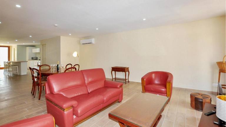 Das Ferienhaus verfügt über drei Schlafzimmer und ist mit Klimaanlage ausgestattet. Zur Einrichtung gehören ein TV, ein Essbereich sowie eine Küche mit Kühlschrank. Ein Wohnzimmer ergänzt die Ausstattung der Unterkunft, die zudem über einen Balkon verfügt.