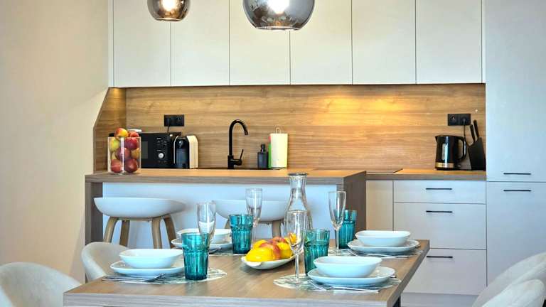 Die Zimmer in der Unterkunft verfügen über einen Balkon, einen Sitzbereich und einen Flachbild-TV. Die Küchenzeile ist mit einem Kühlschrank, einem Geschirrspüler, einer Herdplatte, einer Kaffeemaschine und einem Wasserkocher ausgestattet. Jedes Zimmer bietet ein eigenes Badezimmer mit Dusche und Haartrockner.