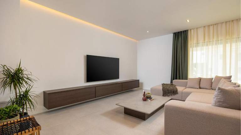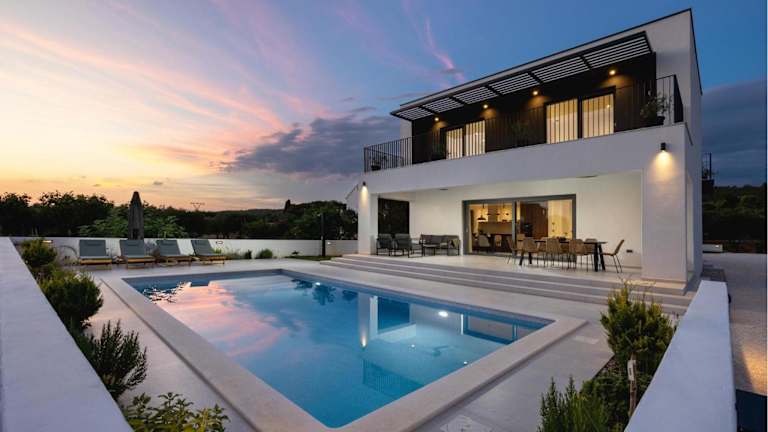 Das Ferienhaus umfasst vier Schlafzimmer und bietet moderne Annehmlichkeiten, darunter Klimaanlage, Flachbild-TV, eine voll ausgestattete Küche mit Kühlschrank und Geschirrspüler sowie einen eigenen Pool.