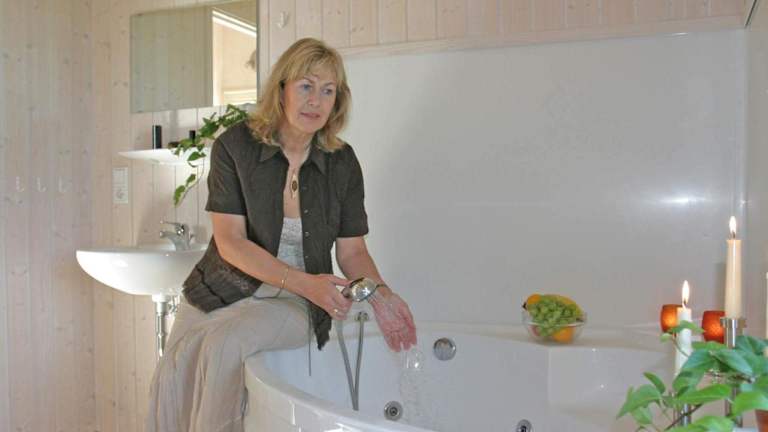 Das Ferienhaus beinhaltet zwei Schlafzimmer und bietet ein Wohnzimmer mit einem TV, eine voll ausgestattete Küche mit Kühlschrank und Geschirrspüler. Es gibt zudem zwei Badezimmer, die entweder mit einer Badewanne oder Dusche ausgestattet sind.