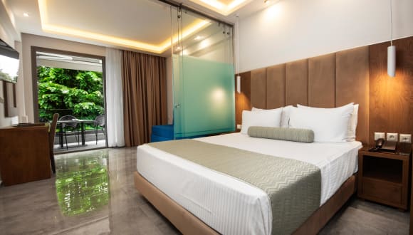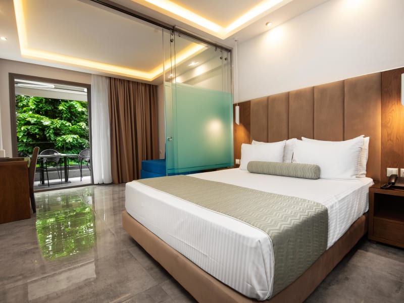 1) Studio 21 m2. Zimmerbeschreibung: Dieses elegante Zimmer bietet Doppelbett und Einzelbett oder Doppelbett und Schlafsofa für 3 Personen mit Küche. Einrichtungen: • Privater Terrasse / Balkon • Moskitonetz • 32-Zoll-Flachbildfernseher • Satellitenkanäle • Laptop-Safe • Klimaanlage / Heizung • 2 Keramikkochfeldern • Mikrowelle • Doppelbett • Schlafsofa / Einzelbett • Schallschutz • Fliesenboden • Kleiderschrank • Wlan•Toilettenartikel • Dusche • Haartrockner • Bademantel • Toilette • Hausschuhe • Kühlschrank • Handtücher-Bettwäsche • Telefon • Kostenloses WLAN • Speziell angefertigte Matratzen aus natürlichen Materialien sorgen für erfrischenden Schlaf. 2) Superior Zimmer 28 m2. Zimmerbeschreibung: Dieses Zimmer bietet miteinander verbundenen Platz für Schlaf- und Wohnzimmer, 1 Doppelbett und ein Schlafsofa für 2 Personen mit Küche. Dieses Familienzimmer für 4 Personen verfügt über ein elegantes Dekor und eine private Terrasse oder einen Balkon, der mit Sitzgelegenheiten ausgestattet ist und einzigartige Momente der Entspannung bietet. Einrichtungen: • Privater Terrasse / Balkon • Moskitonetz • 32” Zoll-Flachbildfernseher • Satellitenkanäle • Safe in Laptopgröße • Klimaanlage / Heizung • 2 Keramikkochfeldern • Mikrowelle • Doppelbett • Schlafsofa • Schallschutz • Fliesenboden • Kleiderschrank • Wlan•Toilettenartikel • Dusche • Haartrockner • Bademantel • Toilette • Hausschuhe • Kühlschrank • Handtücher-Bettwäsche • Telefon • Kostenloses WLAN • Speziell angefertigte Matratzen aus natürlichen Materialien sorgen für erfrischenden Schlaf. 3) Wohnung auf zwei Etagen 38 m2. Zimmerbeschreibung: Ein geräumiges Zimmer auf zwei Ebenen für 6 Personen mit Küche in der unteren Etage verfügt über 1 Doppelbett und 1 Schlafsofa und die obere Ebene bietet 2 Einzelbetten. Das WC ist auf beiden Ebenen verfügbar. Einrichtungen: • Privater Terrasse / Balkon • Moskitonetz • 32” und 19” Zoll-Flachbildfernseher • Satellitenkanäle • Safe in Laptopgröße • Klimaanlage / Heizung • 2 Keramikkochfeldern • Mikrowelle • Doppelbett • Schlafsofa • 2 Einzelbetten • Schallschutz • Fliesen Boden •Wlan• Kleiderschrank • 2 WC toillette • Toilettenartikel • Dusche • Haartrockner • Bademantel • Hausschuhe • Kühlschrank • Handtücher-Bettwäsche • Telefon • Kostenloses WLAN • Speziell angefertigte Matratzen aus natürlichen Materialien sorgen für erfrischenden Schlaf. 4) Duplex Wohnung 42 m2 Zimmerbeschreibung: Dieses Zimmer für 6 Personen bietet getrennten Schlafraum, ein Schlafzimmer mit 1 Doppelbett, ein weiteres Schlafzimmer mit 2 Einzelbetten und ein Wohnzimmer mit Küche und ein Schlafsofa für 2 Personen. Einrichtungen: • Privater Terrasse / Balkon • Moskitonetz • 32” und 19” Zoll-Flachbildfernseher • Satellitenkanäle • Laptop-Safe • Klimaanlage / Heizung • Elektroherd mit 2 Keramikkochfeldern • Doppelbett • Schlafsofa • 2 Einzelbetten • Schallschutz • Fliesen Boden • Kleiderschrank • Toilettenartikel • Dusche • Haartrockner • Bademantel • Toilette • Hausschuhe • Kühlschrank • Wlan•Kaffeemaschine • Handtücher-Bettwäsche • Telefon • Kostenloses WLAN • Speziell angefertigte Matratzen aus natürlichen Materialien sorgen für erfrischenden Schlaf.