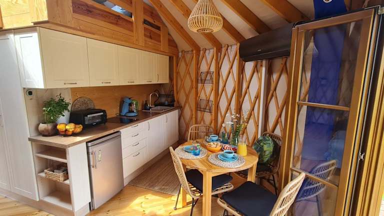 Die Unterkünfte im 4 Żywioły - Jurty w Sudetach bieten Ihnen einen komfortablen und gemütlichen Rückzugsort. Jede Unterkunft verfügt über eine Terrasse mit atemberaubendem Bergblick, eine Küchenzeile mit Kühlschrank und Kochfeld sowie ein eigenes Bad mit Dusche. Die klimatisierten Unterkünfte bieten Ihnen zudem einen separaten Sitz- und/oder Essbereich, in dem Sie sich entspannen können.