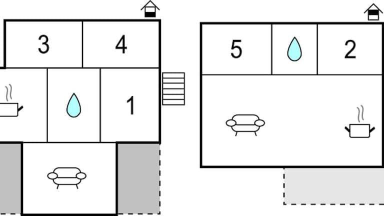 Das Ferienhaus umfasst fünf Schlafzimmer, ein Wohnzimmer und zwei Badezimmer, die mit einer Badewanne ausgestattet sind. Ein Fernseher ist ebenfalls vorhanden.