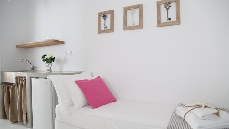 Die Unterkünfte in der 8 Keys Residence sind im modernen Kykladen-Stil gestaltet und bieten einen komfortablen Aufenthalt. Jede Unterkunft verfügt über einen Flachbild-TV und einige haben auch eine Terrasse oder einen Balkon mit Meerblick oder Blick auf den Garten. Eine Küchenzeile mit einem Kühlschrank ist ebenfalls vorhanden. Die Bettwäsche wird gestellt, um Ihnen einen angenehmen Aufenthalt zu ermöglichen.