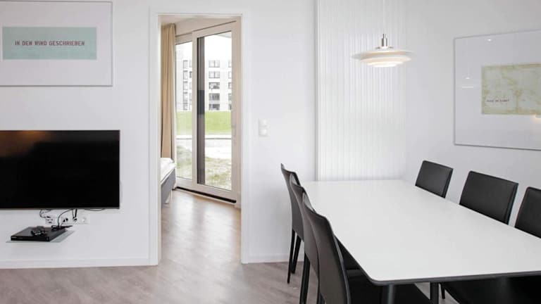 Das Apartment verfügt über drei Schlafzimmer, ein Wohnzimmer mit TV, eine voll ausgestattete Küche mit Kühlschrank und Geschirrspüler sowie ein Badezimmer mit Dusche. Das Ferienhaus bietet Platz für bis zu acht Personen und ist somit ideal für größere Gruppen oder Familien. Kostenfreies WLAN steht Ihnen ebenfalls zur Verfügung.