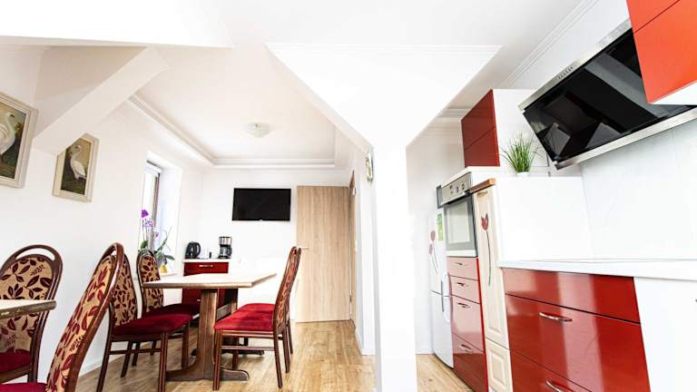 Die Ferienwohnung umfasst zwei Schlafzimmer, eine Küche, die mit einem Kühlschrank und einem Geschirrspüler ausgestattet ist, sowie ein Badezimmer mit einer Badewanne, Haartrockner und Waschmaschine. Handtücher und Bettwäsche werden bereitgestellt. Gäste profitieren zudem von Annehmlichkeiten wie Rauchmeldern und Videoüberwachung im Außenbereich.