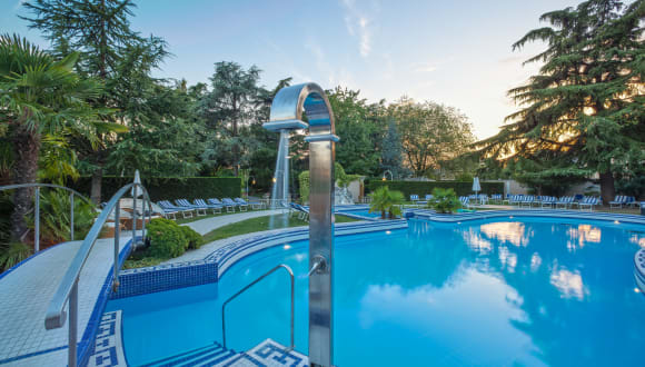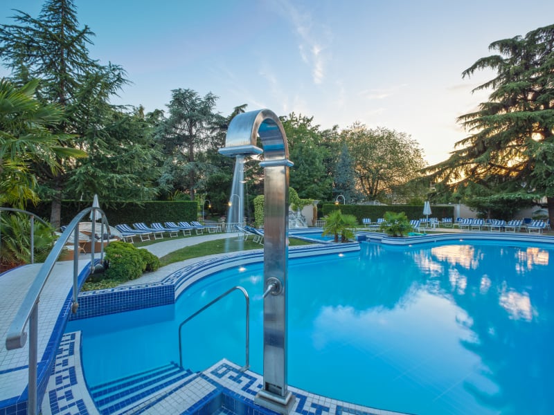 SCHWIMMBECKEN Wasser und Entspannung Entspannen Sie in unserem heißen Thermalwasser Sehen Sie im privaten, 6000 m² großen Park zwei halb-olympische Schwimmbecken, Hallen- und Freibad mit Thermalwasser und miteinander verbunden, Aquafitness-Ecke, Bereich für Massage und Nackenmassagestrahl. Die Architektur des Innenbereiches des Schwimmbades ist inspiriert von den Arbeiten des Architekten Pier Luigi Nervi, mit Sicht auf Betongewölbe. Unsere Schwimmbäder sind von 8 bis 23 Uhr verfügbar! Der Park und die Schwimmbäder bieten reichhaltige und lebhafte Momente: Trimm-dich-Pfad, köstliches Barbecue, Aquagymnastik- und Aquahealingkurse, Live-Musik, Bar, Sauna, türkisches Bad und Solarium. Im Außenbereich befindet sich ein neuer HydroRelax Pool, ein Konzentrat des Wohlgefallens und Wohlbefindens im Thermalwasser im Grünen unseres Parks. Im HydroRelax Pool werden Sie die Wohltat von verschiedenen Hydromassagestrahlen ausprobieren können; benutzen Sie zwei verbundene Hydromassage-Höhlen (durchgreifende Hydromassage auf verschiedene Muskelbereiche des Körpers und wohltuender Effekt auf den Kreislauf), zwei Hydromassage-Liegen (Massage von mittlerer Intensität auf den ganzen Körper, die stimuliert und die Haut mit Sauerstoff anreichert), einen Nackenstrahl (intensive und entspannende Effekte auf die Halswirbel), und eine Hydromassage-Bank (gute Aktivierung des Kreislaufes im Lendenbereich). THERMALWASSER Die Reichhaltigkeit unserer THERMEN ist durch das Salz-Brom-Jod-Wasser gegeben, welches sich im Untergrund befindet und geothermischen Ursprungs ist. Von den Voralpen dringt Regenwasser in den Untergrund ein bis zu einer Tiefe von ungefähr 3000 m; dabei wird es mit Mineralsalzen angereichert und erwärmt sich fortschreitend. In über 25 Jahren durchläuft es ungefähr 100 km und erreicht dann die Euganeische Umgebung, wo es wegen der besonderen strukturellen Bedingungen des Erdbodens einen schnellen Aufstieg bis zu den Thermalbrunnen vollzieht. Die Wassertemperatur der Becken wird bei 33°C gehalten und die Konstanz dieser Temperatur wird von einem automatischen System gehalten, was außerdem Hygiene und Sicherheit desselben Wassers garantiert. In der Brunnenöffnung ist die Wassertemperatur ungefähr 87 °C. Warm und angenehm, wertvoll und kostbar, wohltuend und therapeutisch, wird das Wasser für die Reifung des Fangos, für Inhalationstherapien und in den Thermalbädern und –becken benutzt.