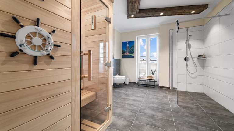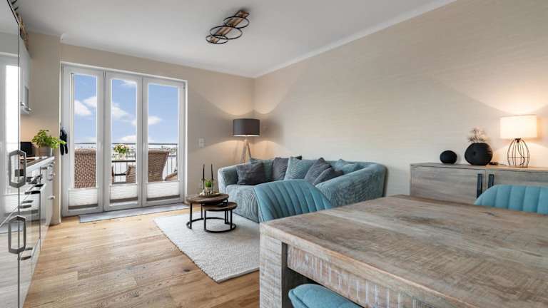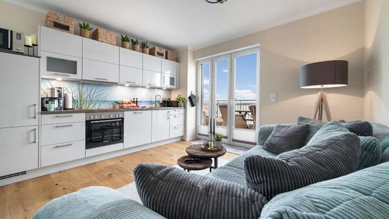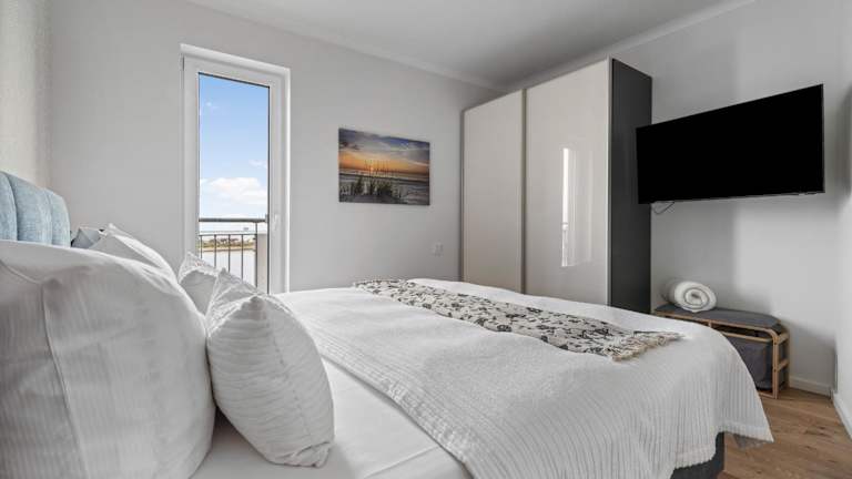 Admiralsblick- 2 OG bietet Übernachtungsmöglichkeiten mit Blick auf das Hafenbecken. Diese Ferienwohnung ist ausgestattet mit zwei Schlafzimmern, einer Küche, einem Badezimmer und einem Balkon.