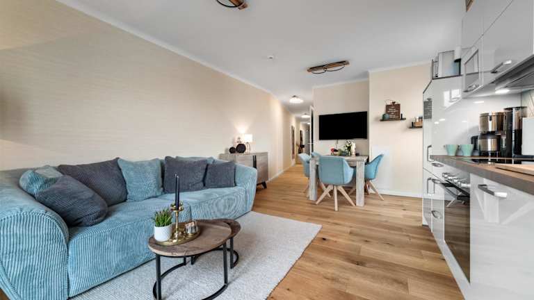 Die Ferienwohnung umfasst zwei Schlafzimmer, eine Küche mit Kühlschrank und Geschirrspüler, ein Badezimmer mit Dusche, Haartrockner und Waschmaschine sowie einen TV und kostenloses WLAN. Ein Balkon ergänzt die Ausstattung.