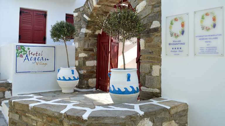 Das Aegean Village befindet sich in der Fußgängerzone der Altstadt von Parikia, nur 200 m vom Hafen und der berühmten Kirche Ekatontapiliani entfernt. In unmittelbarer Nähe finden Sie zahlreiche Geschäfte, Kunstgalerien und ein lebhaftes Nachtleben. Die Lage des Hotels ermöglicht es Ihnen, die Sehenswürdigkeiten von Parikia bequem zu Fuß zu erkunden. Auch der zentrale Busbahnhof und einige der schönsten Strände der Insel sind in weniger als 10 Gehminuten erreichbar.