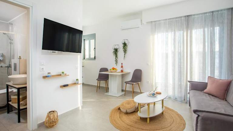 Die klimatisierten Apartments der Aetheria Central Apartments bieten Ihnen einen herrlichen Meerblick und kostenfreies WLAN. Jedes Apartment verfügt über eine Terrasse, auf der Sie entspannen und die Aussicht genießen können. Im Innenbereich erwarten Sie ein komfortabler Sitzbereich sowie ein Flachbild-Sat-TV. Die voll ausgestattete Küche bietet Ihnen alles, was Sie für die Zubereitung Ihrer Mahlzeiten benötigen, einschließlich Kühlschrank, Backofen, Kochfeld, Kaffeemaschine und Wasserkocher. Das private Badezimmer ist mit einer Dusche und kostenlosen Pflegeprodukten ausgestattet.