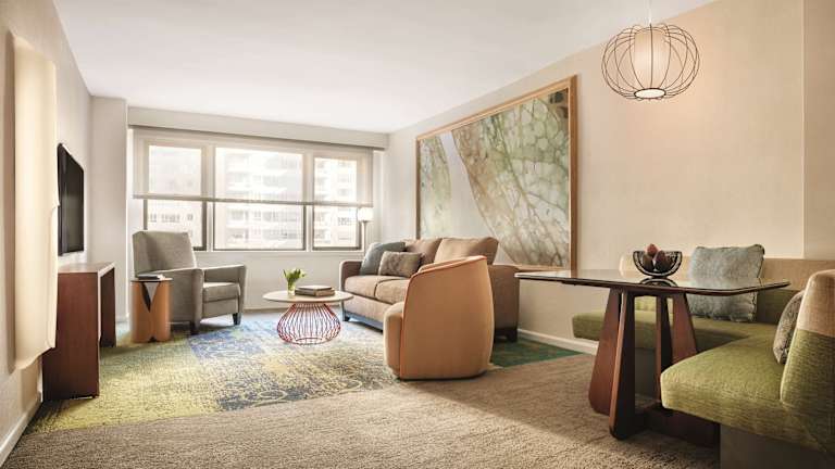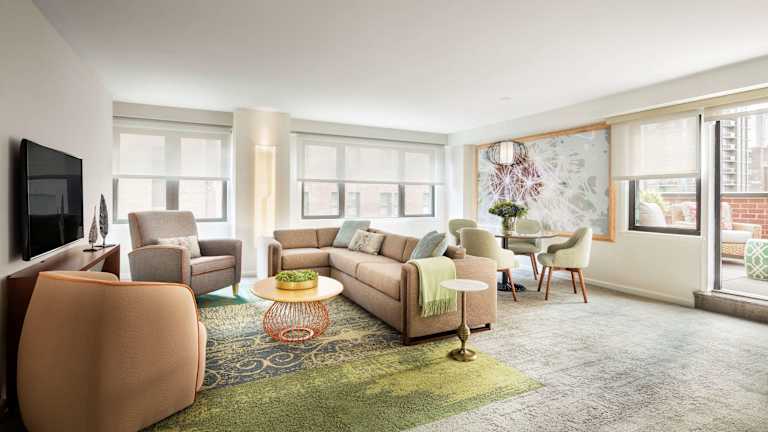 Die Suiten im The Gardens Sonesta ES Suites New York sind urban gestaltet und bieten modernen Komfort. Jede Suite verfügt über eine komplett ausgestattete Küche, einen Wohnbereich mit Flachbild-TV und WLAN. Die geräumigen Zimmer sind mit großen Fenstern und modernen Möbeln ausgestattet und bieten eine angenehme Atmosphäre.