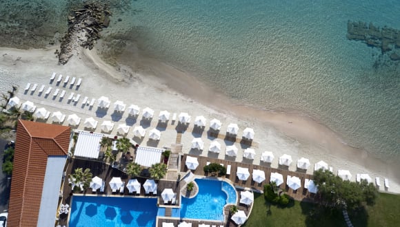 In der direkten Nähe vom flachen, goldenen Strand im Toroneus Golf genestet, unter dem reizendem Grün, mit kristalklarem Meer vor sich, befindet sich dieses Boutique Hotel in einer privaten und ruhigen Umgebung, was einen Hauch von Eleganz und Lifestyle-Kultur von sich gibt. Die Gäste können Ihre Tage am Strand , zwischen den zwei wunderschönen beheizten Aussenpools (April und Oktober), im Open-Air-Jacuzzi genießen oder auch eine erholsame Massage entweder im aussenbereich direkt neben dem Strand und unter den tropischen Palmen genießen. Die stylishe und sehr moderne Zimmer sind alle individuell von diversen Design Firmen, wie z.B. Bo-concept, Casa Vogue und Zara Home, eingerichtet und alle genießen einen herrlichen Meerblick oder seitlichen Gartenblick. Im “Daphne“ Poolbereich-Restaurant kann man beim Frühstück verschiedene frische hausgemachte Ofengebäck-Produkte, vor den eigenen Augen zubereitete Omellettes, Pfannkuchen und viele a-la-Carte Auswahlen, bestellen und genießen. Zum Mittagessen lassen Sie sich im “Mesogeios” a-la-Carte Restaurant bei diversen kulinarischen Gerichten von unserem bekannten Chef, Andreas Lagos, verwöhnen. Das gut erhaltene Dorf Afitos mit seiner einzigartigen Architektur, reichen alten Geschichte und traditionellen Geschäften ist nur 150m Fußweg vom Hotel entfernt.