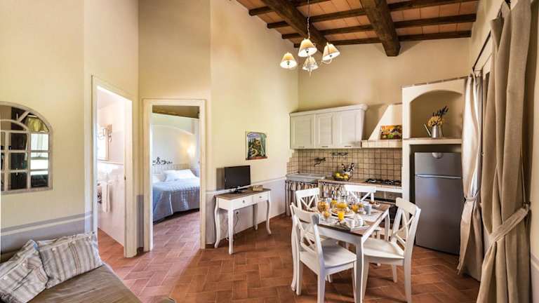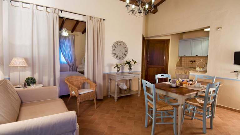 Die Apartments im Agriturismo Poggio Di Maremma sind rustikal und gleichzeitig elegant gestaltet. Mit Holzbalkendecken und schmiedeeisernen Betten strahlen sie einen charmanten Landhausstil aus. Jedes Apartment verfügt über einen eigenen Eingang, ein Wohnzimmer und eine Küchenzeile. Zur Ausstattung gehören auch ein TV und eine private Terrasse mit Blick auf die umliegende Landschaft. Hier können Sie entspannen und die Ruhe der Natur genießen.