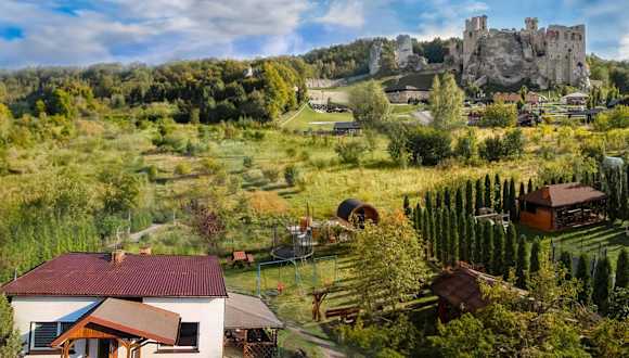 Agroturystyka na Jurze Apartamenty z widokiem na Zamek bietet Selbstversorgerunterkünfte mit kostenlosem WLAN, Kinderspielplatz, Garten und kostenfreien Privatparkplätzen. Die Unterkünfte verfügen über Parkettböden, einen Flachbild-TV mit Kabelanschluss, eine ausgestattete Küche und private Badezimmer mit Dusche. Einige Einheiten bieten zudem einen Balkon oder eine Terrasse mit Gartenblick.