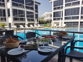 Alle Apartments verfügen über eine voll ausgestattete Küchenzeile mit Kühl- / Gefrierkombination, Waschmaschine, Backofen, Gasherd, Dunstabzugshaube und Wasserkocher. Koch- und Essgeschirr ist ausreichend vorhanden. Klimaanlagen warm/kalt in den Wohn- und Schlafräumen sorgen für ein angenehmes Raumklima. Weiterhin sind die Apartments ausgestattet mit Keramikfliesen, Laminatböden, Flatscreens und Garderoben. Freies WLan sowie TV-Programm über Astra und Türk-Sat sind selbstverständlich. Auf Wunsch kann ein Babybett bereitgestellt werden. Auch ein Bügelbrett und Bügeleisen halten wir für Sie bereit. Vielleicht möchten Sie auch mehrere Monate bei uns verbringen, dazu unterbreiten wir Ihnen gerne ein attraktives Angebot. 1 + 1 Apartment für bis zu 5 Personen vereinzelt mit kleinem Balkon am Schlafzimmer. 2 + 1 Apartment für bis zu 6 Personen mit kleiner Terrasse.