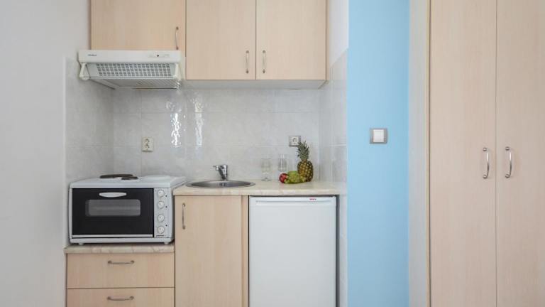Die klimatisierten Wohneinheiten sind mit einer voll ausgestatteten Küchenzeile ausgestattet, welche einen Kühlschrank und eine Herdplatte umfasst.