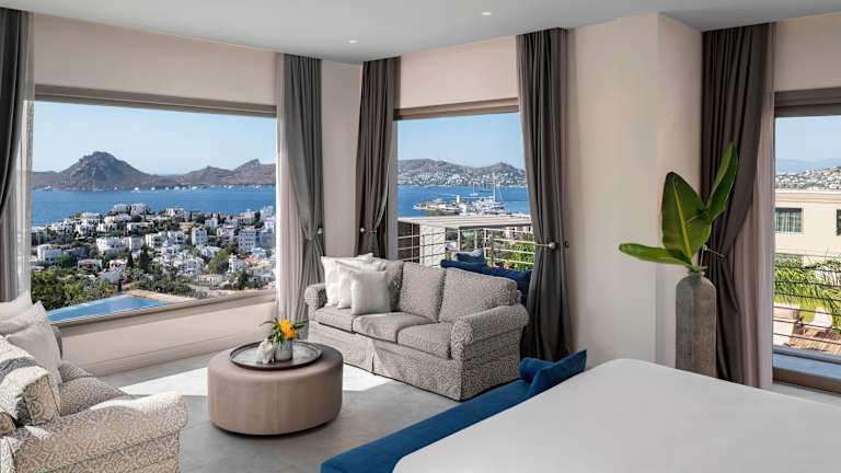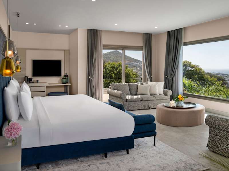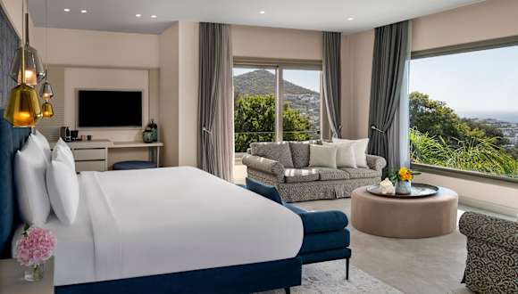 Die klimatisierten Zimmer des Hotels verfügen über einen Balkon oder eine Terrasse mit Meerblick. Zur Ausstattung gehören entweder ein Queensize-Bett oder ein Kingsize-Bett, eine Minibar, ein Safe, eine Tee-/Kaffeemaschine sowie ein TV-Gerät. Die Badezimmer sind mit einer Dusche und einer Badewanne ausgestattet. Ein Haartrockner sowie Bademäntel stehen ebenfalls zur Verfügung.
