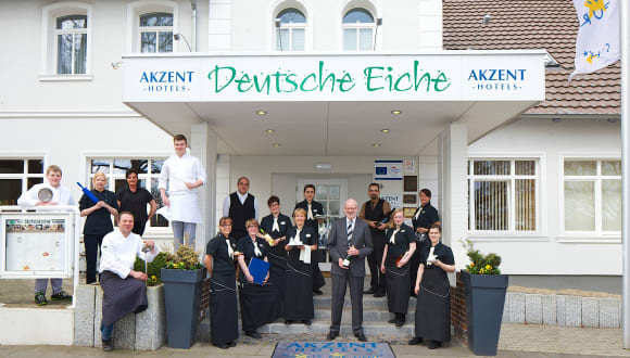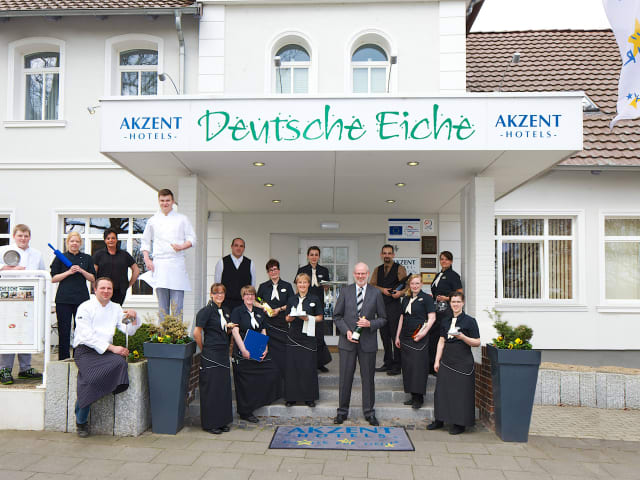 Das AKZENT Hotel und Restaurant Deutsche Eiche ist ein familiengeführter Betrieb. Die Deutsche Eiche verfügt über 36 komfortable Zimmer unterschiedlicher Ausstattung, eine Juniorsuite, einen Saunabereich, fünf moderne Tagungsräume sowie zwei Restaurants. Die oberen Etagen des Hotels sind bequem mit dem Fahrstuhl zu erreichen. Hunde sind hier herzlich willkommen. Direkt am Hotel sind ausreichend kostenlose Parkplätze sowie Unterstellmöglichkeiten für Fahrräder vorhanden.