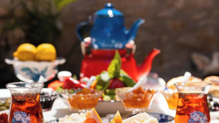 Im Alacati Eski Ev Hotel erwartet Sie jeden Morgen ein traditionelles türkisches Frühstück im Innenhof. Während des Tages können Sie auf Anfrage Fast-Food-Gerichte und Manti bestellen. Zum 5-Uhr-Tee werden hausgemachtes Gebäck und erfrischende Getränke angeboten. Wenn Sie die regionale Küche kennenlernen möchten, können Sie zum Abendessen frische Mezze und andere Gerichte genießen, die mit natürlichem Olivenöl zubereitet werden.