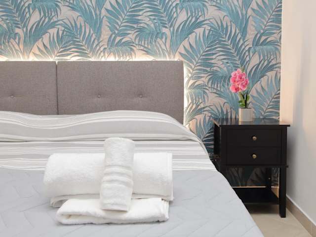Die Ferienwohnung umfasst zwei Schlafzimmer, ein Wohnzimmer sowie eine voll ausgestattete Küche mit Kühlschrank und Kaffeemaschine. Das Badezimmer verfügt über ein Bidet und eine Dusche. Handtücher und Bettwäsche werden bereitgestellt. Die Unterkunft ist klimatisiert und bietet kostenloses WLAN an.