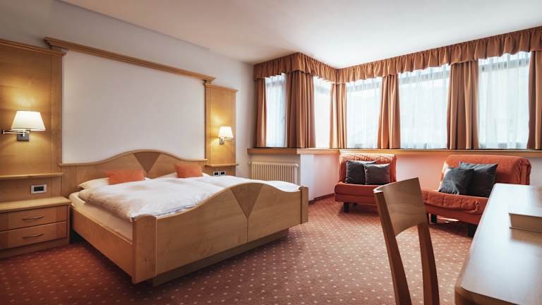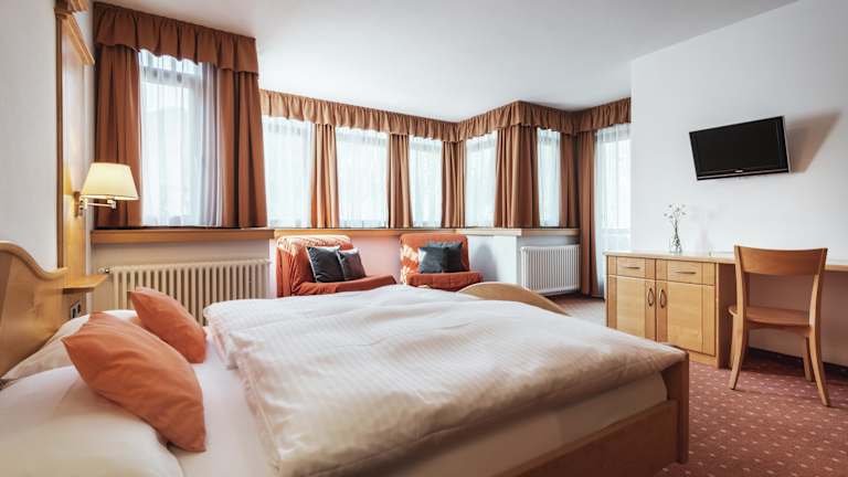 Die Zimmer im Albergo Majerei verbinden den rustikalen Charme der Berge mit modernem Komfort. Die hellen Holzmöbel und der LCD-Sat-TV sorgen für eine gemütliche Atmosphäre. Jedes Zimmer verfügt über einen Balkon mit herrlichem Blick auf die Berge oder die Stadt.