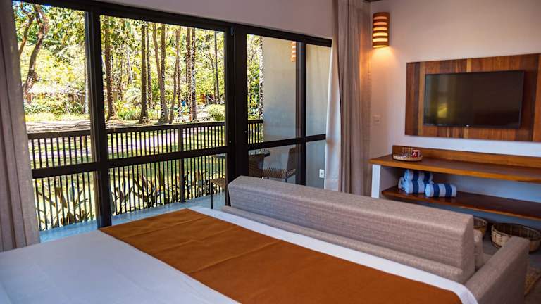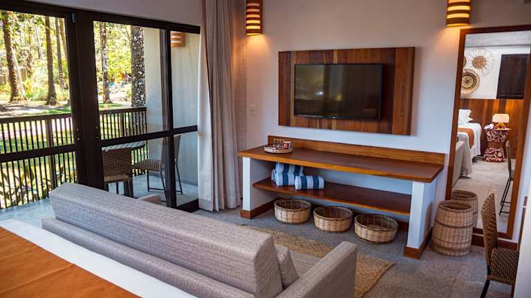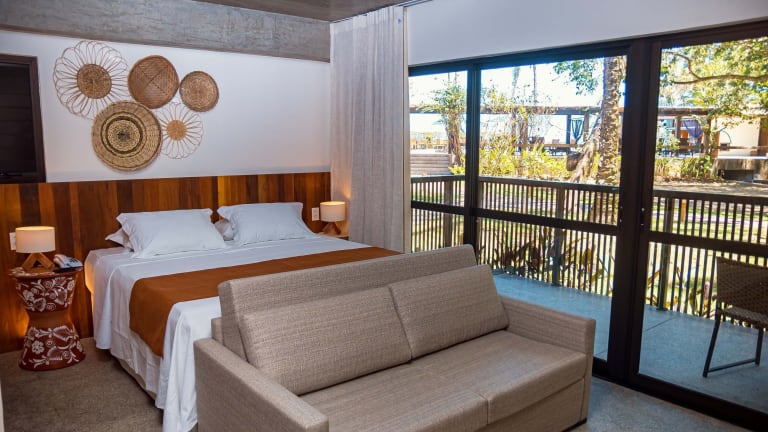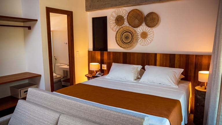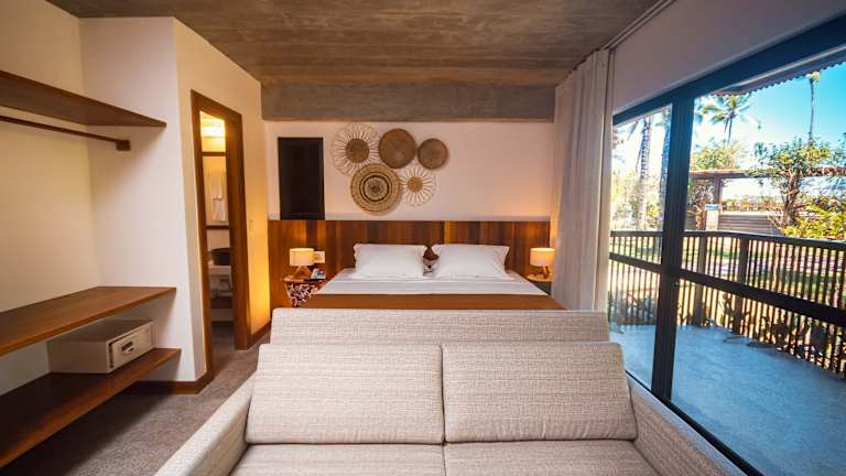 Das Aldeia do Mar Sensorial Hotel bietet Chalets und Suiten mit Balkonen. Die Unterkunft ist von einem großen tropischen Garten umgeben und bietet einen Außenpool sowie eine Sonnenterrasse zur Entspannung. Die Einrichtung der Zimmer ist in hellen Farben und mit verschiedenen Holzarten gestaltet, um eine gemütliche Atmosphäre zu schaffen.