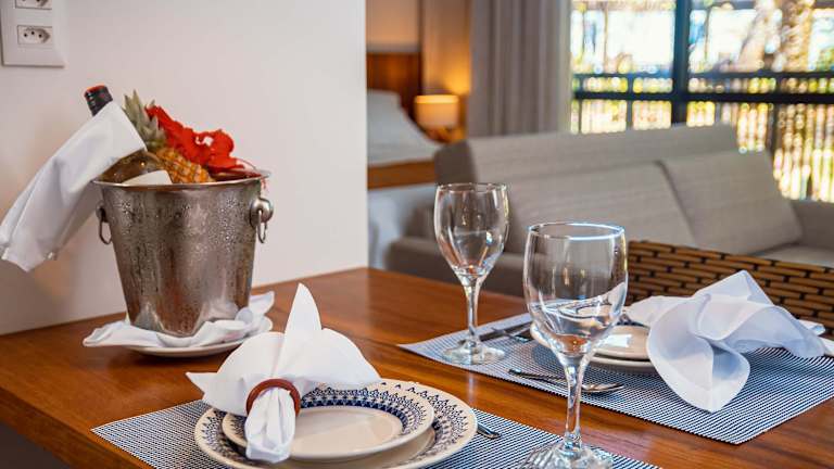 Jeden Morgen wird ein reichhaltiges Frühstücksbuffet serviert. Tagsüber sind Erfrischungen und Getränke im hoteleigenen Restaurant mit Bar sowie am Strand erhältlich, wo ebenfalls ein besonderer Service angeboten wird.